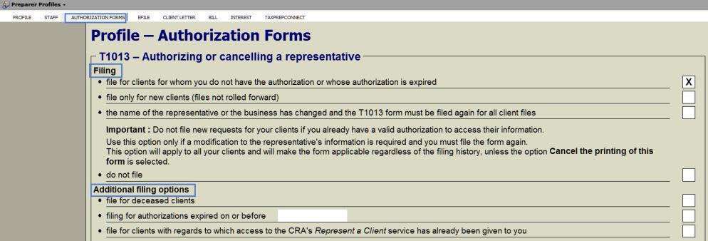 Taxprep determines if the T1013 form is applicable for electronic filing based on information entered in the preparer profile for all of your clients.