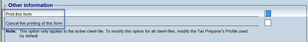 However, you may make a different choice to file a particular T1013 form by selecting either one of boxes Print this form or Cancel the printing of this form in the T1013 form.