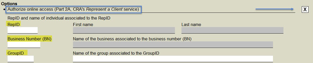 If you want to electronically file the T1013 form and/or use the TaxprepConnect functionality, you must request an online access. To obtain an online access authorization (which includes telephone access or in writing), select the box Authorize online access Part 2A, CRA’s Represent a client service and enter in this section your RepID or GroupID identification number, or your BN. A RepID is a seven-character alphanumeric code starting with letter G, and a BN is a nine digit number. You must also indicate the name associated with the identification number used.