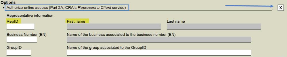 Section A of this part of the form refers to online access and must contain only one of the identifier among a RepID with a first name and a last name, a GroupID with a group name or a BN with a business name.