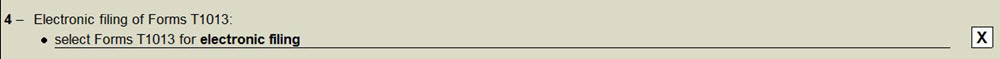 The purpose of the list of criteria in this section of the form is to make it eligible for electronic filing. Therefore, this list ensures that the form meets the conditions related to electronic transmission required by the CRA. When all criteria are complied with, the boxes will be automatically selected and the status of the electronic filing of the T1013 form will be displayed at the end of this section. However, verify the “general” type diagnostics relating to the T1013 form, because the eligibility for electronic filing is directly dependant on those diagnostics.