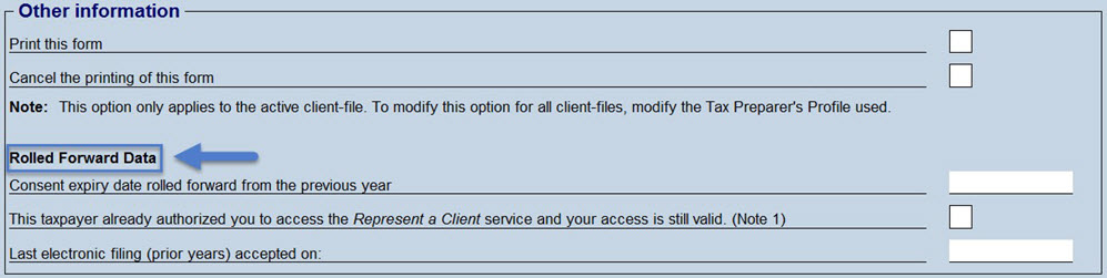 The values of the line Consent expiry date rolled forward from previous year and the box This taxpayer already authorized you to access the Represent a Client service and your access is still valid come from the roll forward of information entered last year.