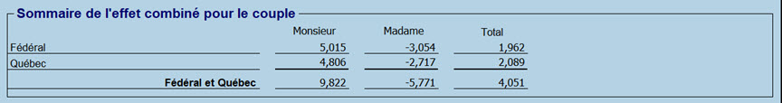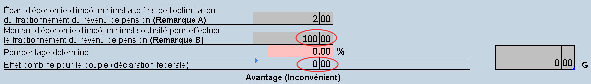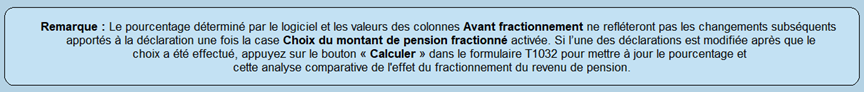 Ce diagnostic ne certifie pas que le fractionnement du revenu de pension est approprié pour le contribuable et son conjoint : il indique la présence d’un revenu de pension admissible et donne une indication à l’effet que le préparateur devrait analyser les situations familiale et fiscale du couple et envisager de procéder au fractionnement.