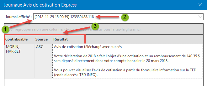 Immédiatement après un téléchargement ADC Express, le logiciel affiche un journal de téléchargement. Ce journal peut également être affiché pour visualiser les résultats de téléchargements antérieurs. Il contient la liste des contribuables pour lesquels un téléchargement a été effectué et fournit, pour chaque contribuable, les résultats de l'opération. Il présente les renseignements suivants :