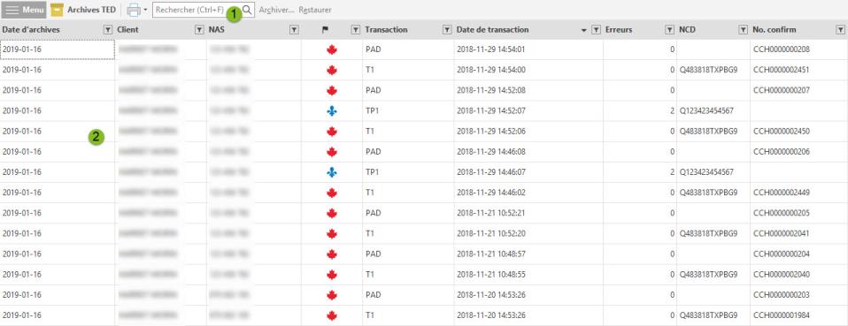 Les différentes colonnes affichées dans la vue Archives TED vous permettent de repérer rapidement les transactions archivées d'un client donné.