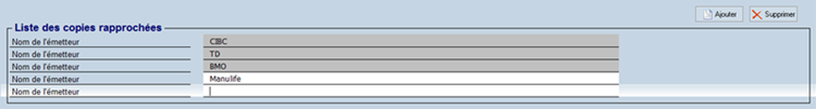 Vous pouvez cependant ajouter un nom d’émetteur dans les champs de saisie de la liste ou encore modifier par substitution le nom d’émetteur d’une copie déjà présente dans la liste. Tout changement apporté aux noms des émetteurs T3 ou tout nouveau nom d’émetteur saisi apparaîtra dans le formulaire T3, État des revenus de fiducie, lorsque les copies rapprochées seront éventuellement transférées vers la déclaration.