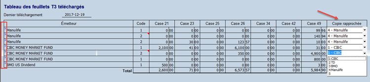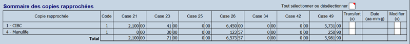 La section « Sommaire des copies rapprochées » affiche chacune des copies rapprochées et est mise à jour automatiquement dès qu’une copie rapprochée est sélectionnée dans les tableaux des feuillets T3 et/ou relevés 16 téléchargés. Les totaux des principales cases sont affichés afin de vous aider à comparer les copies rapprochées avec les feuillets T3 et/ou les relevés 16 consolidés émis par un courtier en valeurs mobilières ou une société de fonds communs de placement.