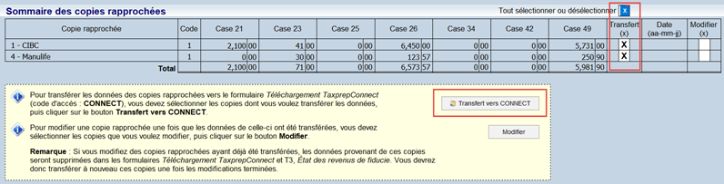 Lorsque tous les feuillets T3 et/ou les relevés 16 ont été téléchargés et rapprochés, vous pouvez, si vous le voulez, transférer les copies rapprochées vers le formulaire Téléchargement TaxprepConnect (code d’accès : CONNECT) puis, à partir de là, les transférer vers la déclaration.