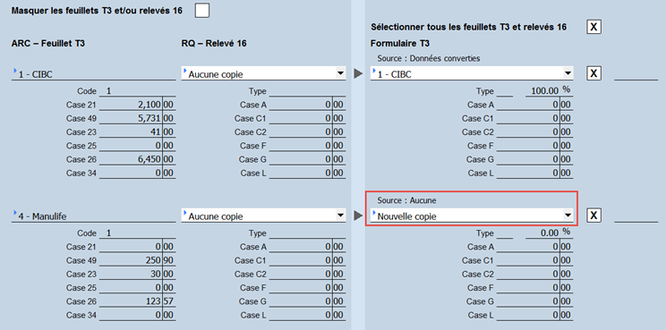 Si le fichier n’a pas été converti ou qu’aucun rapprochement n’a été effectué dans le formulaire Rapprochement des feuillets T3 l’année précédente, vous devez sélectionner la copie rapprochée appropriée pour chaque feuillet/relevé téléchargé. Si vous sélectionnez une même copie pour des feuillets T3 et pour des relevés 16, le logiciel les fera automatiquement correspondre une fois ceux-ci transférés dans le formulaire Téléchargement TaxprepConnect.