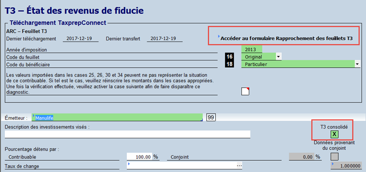 Si vous voulez utiliser le formulaire Rapprochement des feuillets T3 pour une déclaration spécifique, activez la case à cocher située dans le haut du formulaire. Les feuillets T3 et/ou relevés 16 seront alors affichés dans ce formulaire plutôt que dans le formulaire Téléchargement TaxprepConnect. Veuillez noter que dans l’onglet TaxprepConnect des profils du cabinet, une option vous permet d’utiliser par défaut le formulaire Rapprochement des feuillets T3 pour toutes vos déclarations.