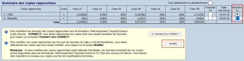 Si vous désirez modifier le contenu d’une copie rapprochée qui a déjà été transférée vers le formulaire Téléchargement TaxprepConnect, activez la case à cocher de la copie à modifier dans la colonne Modifier, puis cliquez sur le bouton Modifier.