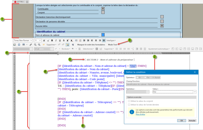 Utilisez le mode Test pour fusionner temporairement la lettre et les données contenues dans la déclaration courante ou une autre déclaration et pour vérifier les résultats.