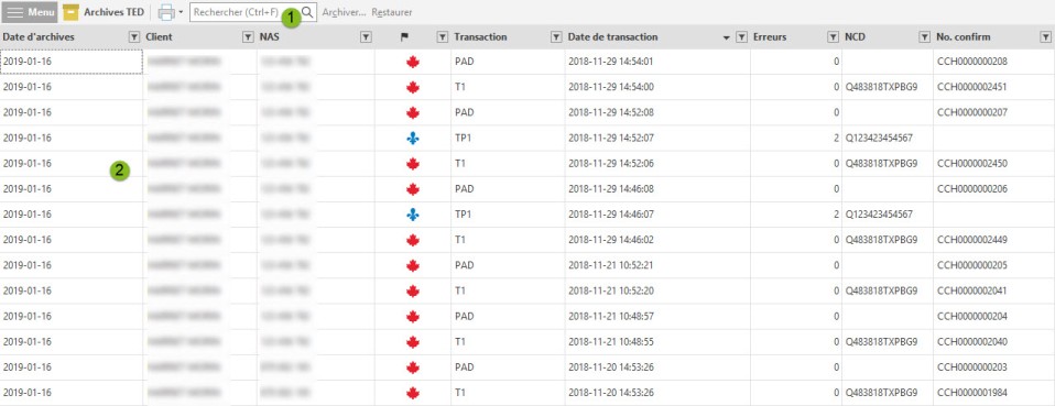 Les différentes colonnes affichées dans la vue Archives TED vous permettent de repérer rapidement les transactions archivées d'un client donné. |