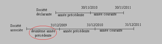 Lorsque l'année d'imposition de la société associée se termine après l'année d'imposition de la société déclarante pour une même année civile, le montant qui doit être considéré pour la société associée est le montant afférent à sa dernière année d'imposition se terminant au cours de l'année d'imposition de la société déclarante. Si l'année d'imposition de la société déclarante qui doit être considérée est l'année d'imposition précédente, l'année d'imposition à considérer pour la société associée sera la deuxième année d'imposition précédente.