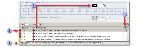 Diagnostics are short messages issued by Corporate Taxprep to warn you of the presence of possible errors or special tax situations which could require you to make a correction or enter supplementary information. The diagnostics appear as a result of an error in data entry (for example, an invalid business number) or an automatic calculation performed by Corporate Taxprep.