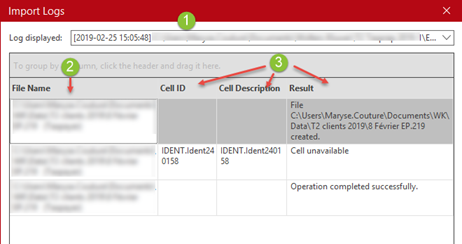 Corporate Taxprep immediately displays an import log following an import. This log contains the list of processed files, and for each client file created, provides the results of the operation as well as the following information: