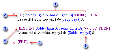 Le champ fiscal [Solde impayé] est utilisé ici pour imprimer le montant du champ si la condition est vraie. La totalité du paragraphe sera imprimée, incluant le champ. |