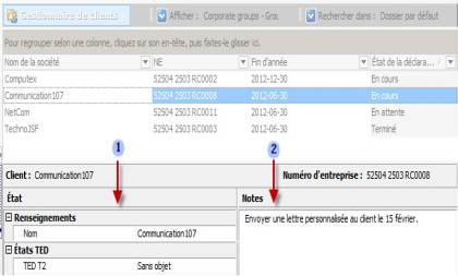 Le volet des propriétés affiché au bas du Gestionnaire de clients vous permet d'inscrire une note jointe et d'effectuer un suivi des différents états d'une déclaration.