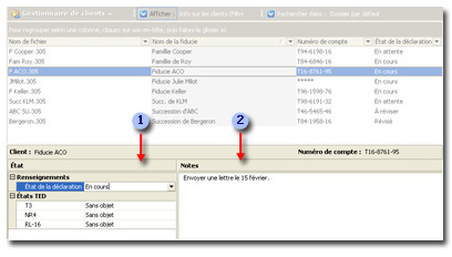 Le volet des propriétés affiché au bas du Gestionnaire de clients vous permet d'inscrire une note jointe et d'effectuer un suivi des différents états d'une déclaration.