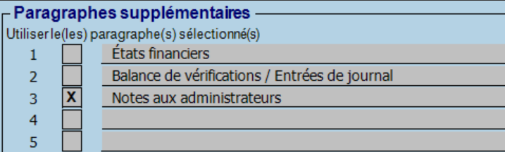 La section « Paragraphes supplémentaires » contient une série de champs permettant aux préparateurs de sélectionner un ou plusieurs paragraphes à ajouter à la lettre au client.