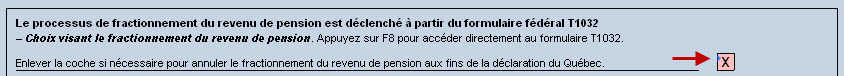Lorsqu’il n’est pas approprié de fractionner un revenu de pension, la case à cocher du formulaire T1032 doit simplement être désactivée, ce qui aura pour effet d’annuler tous les calculs reliés au fractionnement du revenu de pension.