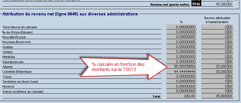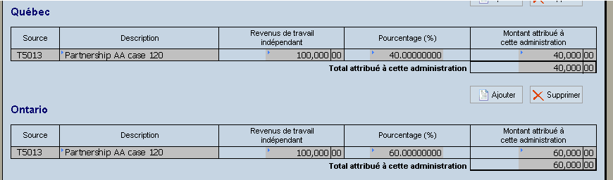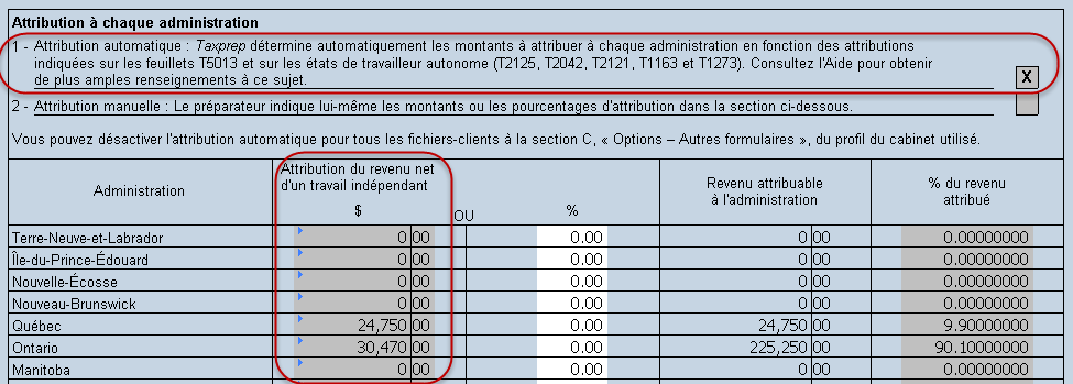 Taxprep est en mesure d'effectuer automatiquement l’attribution aux différentes administrations dans le formulaire T2203 en se basant sur les revenus nets provenant de différentes sources (le feuillet T5013 et les états de travailleur indépendant).