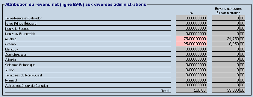Veuillez noter que l’attribution automatique effectuée à partir des états de travailleur indépendant varie selon la province indiquée dans l’adresse postale indiqué dans l’état de travailleur indépendant. De plus, il est possible de définir manuellement (c.-à-d. par substitution) des pourcentages d’attribution directement dans la section « Attribution du revenu net aux diverses administration » d’un état de travailleur indépendant. Les pourcentages sont alors transférés et affichés dans la grille T2203 Détail.
