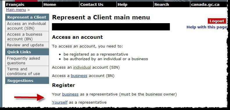 - On the CRA Web site, log on to the Represent a Client service using your CRA user ID and password, and register your business (using your business number (BN)), or register as a representative, to obtain a RepID or a GroupID.