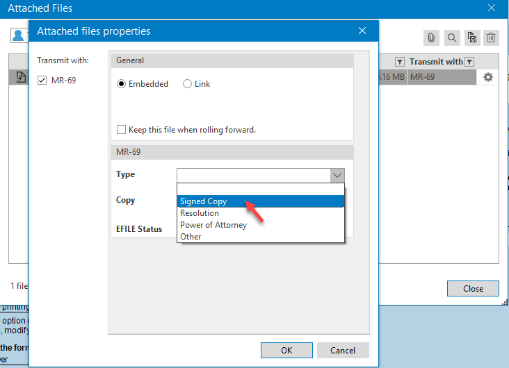 - In addition, if the signee is not the taxpayer*, a supporting document confirming that the signee is the legal representative of this taxpayer is required. This supporting document must also be attached** to the client file as the signed MR-69 form. In the Attached files properties box, select Resolution, Power of Attorney or Other from the Type list, as applicable.