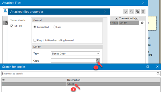 - Then, the signed mandate must be scanned and attached* to the client file. From the File menu, click Attached Files. The Attached files properties box will open when the signed mandate is attached to the form. Next, select Signed Copy from the Type list.