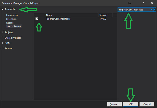 - On the left panel, select Assemblies then search for TaxprepCom.Interfaces and add this reference.