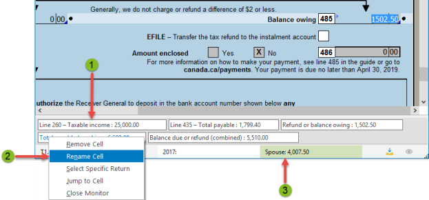 The monitor options in the Options and Settings dialog box include cells that display the combined values from the taxpayer and spouse returns (e.g. combined total tax payable) so that you can more easily keep track of the tax position of the couple. The values for these cells will be the same regardless of which return is active or which return is specified.