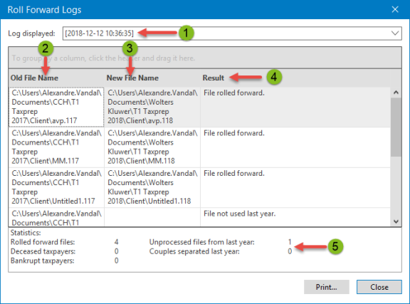 Personal Taxprep will display a log immediately following a roll forward if the appropriate option is selected. You can also display the log for a previous roll forward. This log contains the list of files processed and, for each client file created, the results of the roll forward as well as the following information: