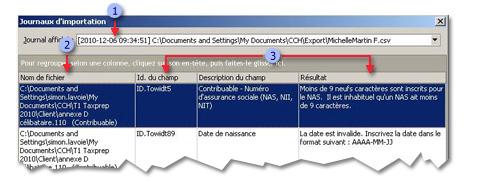 - Dans la zone Journal affiché, cliquez sur le journal d'importation que vous voulez consulter.