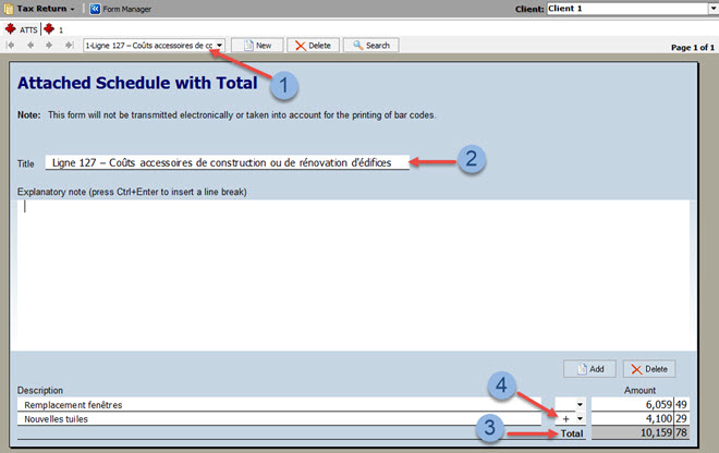 You can attach a schedule to a numerical cell to support the data in this cell. This is useful when you want to provide more detailed information than what is allowed in the cell or when explaining an unusual amount. You can also use this schedule to create a questionnaire or a checklist to interview your clients.