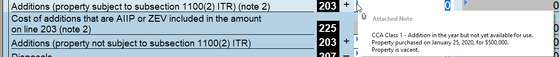 For CCA class 14, when the answer to the custom question Is one of the properties an AIIP? is Yes, the amount entered on line 225, Cost of additions that are AIIP included in the amount on line 203, is calculated and equals the amount on line 203, Current-year additions. The latter is then used to calculate the amount on the line Maximum allowable CCA taking into account clause 1100(1)(c)(i)(A) ITR.