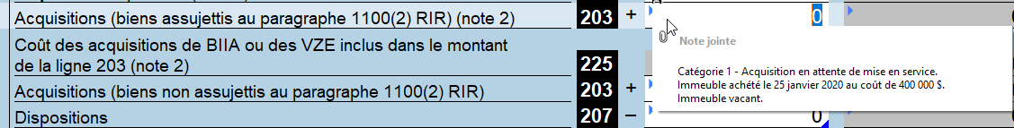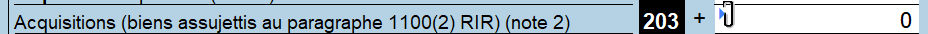 - Lorsque le montant de la ligne 203, Acquisitions (biens assujettis au paragraphe 1100(2) RIR), n’est pas calculé (car les biens inclus dans la catégorie ne sont pas inscrits dans les copies de l’annexe 8 GRILLE ADD) et qu’un montant y est saisi manuellement :