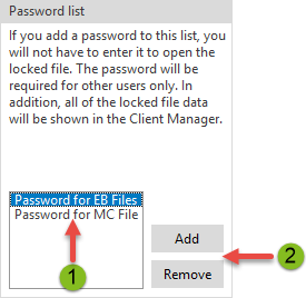 Taxprep for Trusts allows you to store passwords in a password list. Once a password is added to your password list, you will not be required to enter it every time you open the corresponding protected file. All client file data will also be displayed in the Client Manager.