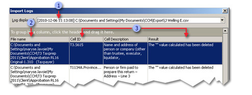 Taxprep for Trusts immediately displays an import log following an import. This log contains the list of processed files, and for each client file created, provides the results of the operation as well as the following information: