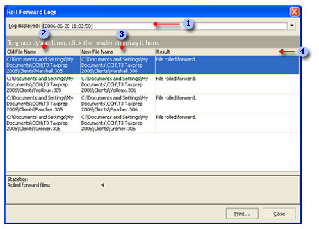 Taxprep for Trusts will display a log immediately following a roll forward if the appropriate option is selected. You can also display the log for a previous roll forward. This log contains the list of files processed and, for each client file created, the results of the roll forward as well as the following information: